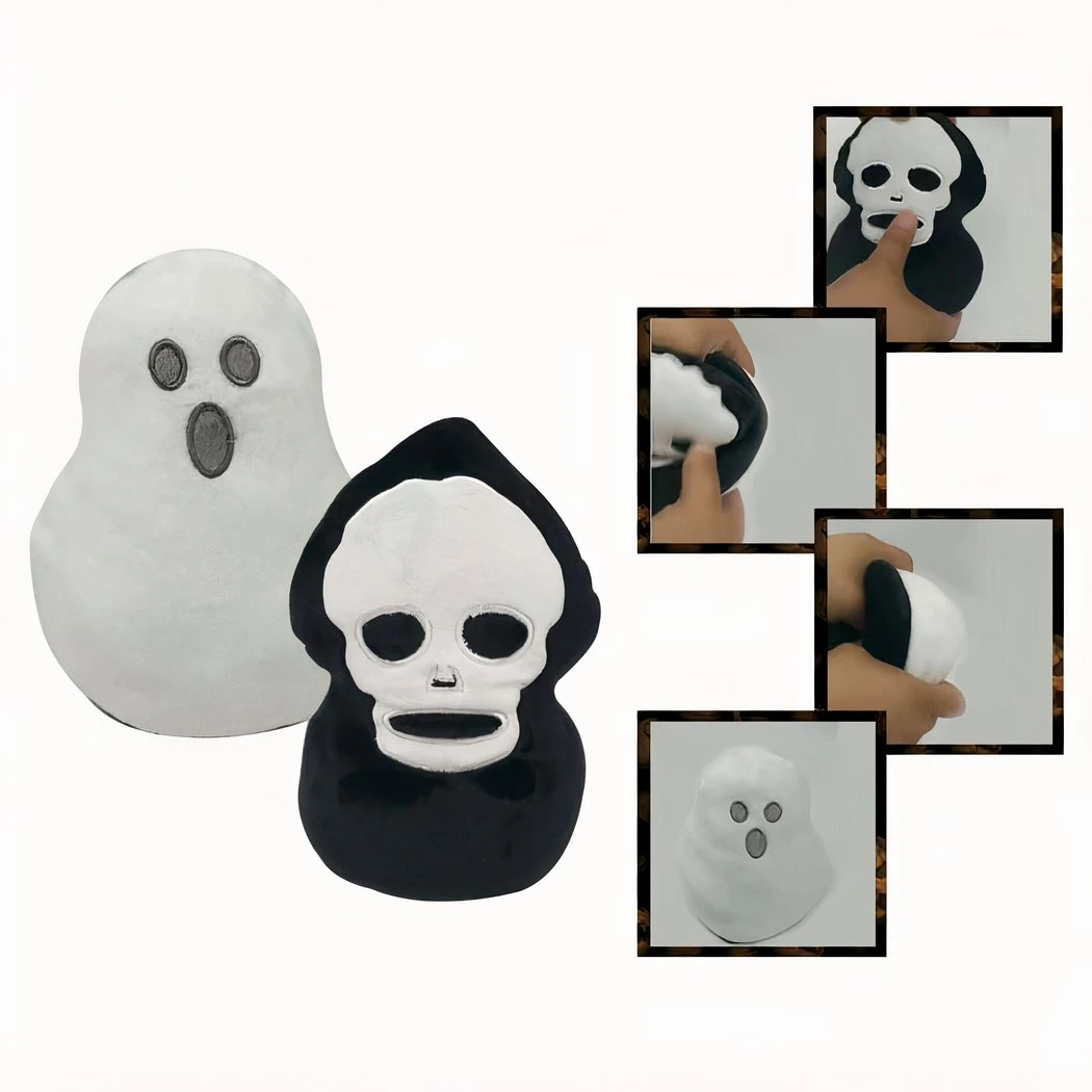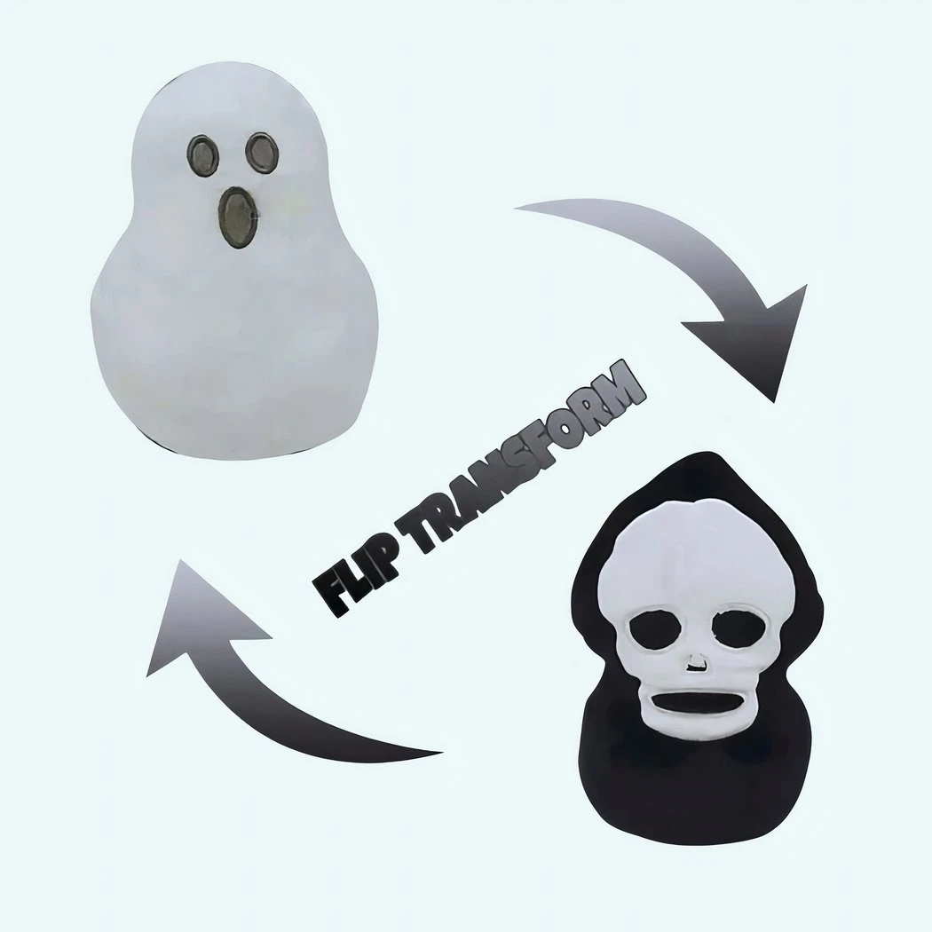 Cette peluche réversible est parfaite pour les amateurs de fantômes et de têtes de mort ! Elle est en forme de tête de mort avec des yeux qui brillent dans le noir, et elle est enveloppée dans un tissu doux et moelleux. Retournez-la et vous avez une peluche tout à fait normale, avec un visage souriant et mignon.